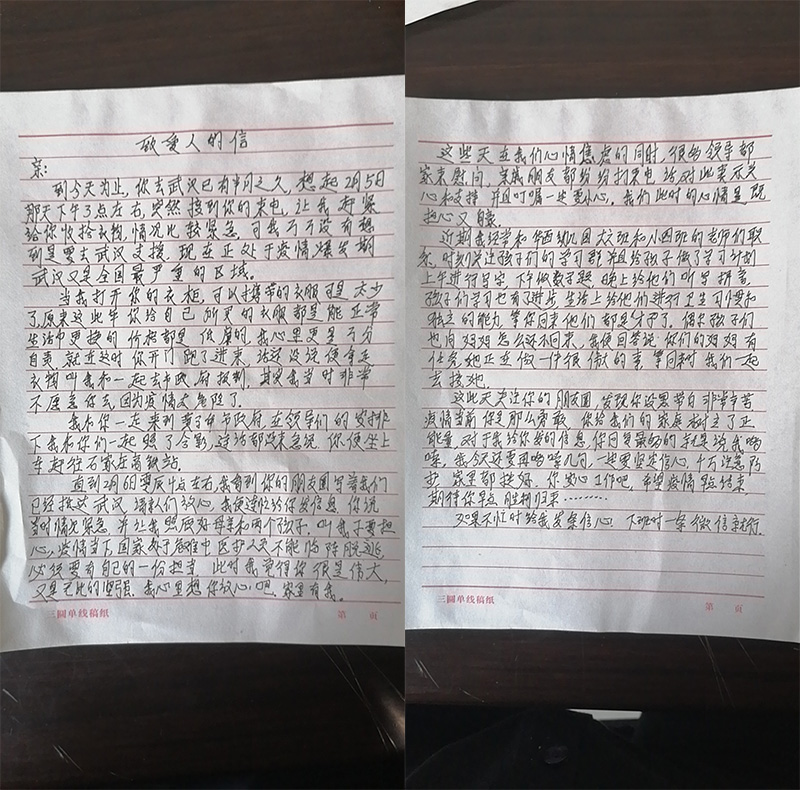直到2月6日凌晨4點(diǎn)左右,我看到你的朋友圈寫道:我們已經(jīng)抵達(dá)武漢,請親人們放心。我連忙給你發(fā)信息,你說當(dāng)時(shí)情況緊急,讓我照顧好母親和兩個(gè)孩子,讓我不要擔(dān)心,疫情當(dāng)下,國家處于危難之中,醫(yī)護(hù)人員不能臨陣脫逃,必須要有一份擔(dān)當(dāng)。此時(shí)我覺得你很偉大,又無比堅(jiān)強(qiáng)。我心想,你放心吧,家里有我!