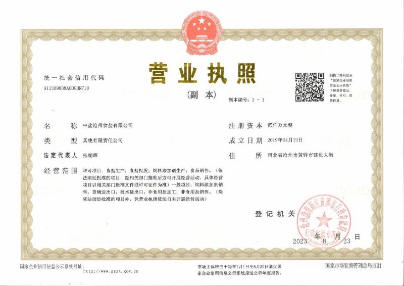 8月23日,中鹽滄州食鹽有限公司在渤海新區(qū)黃驊市成功注冊成立。中鹽滄州食鹽項目是滄州鹽業(yè)集團公司深入學(xué)習(xí)貫徹習(xí)近平總書記視察河北重要講話精神,落實央企落戶河北戰(zhàn)略舉措的重要成果,是落戶河北的第一家中央企業(yè)。